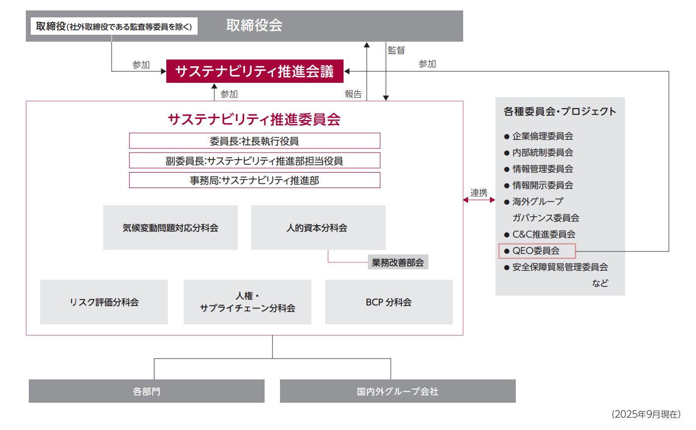 | QEO委員会 | 品質マネジメントシステム(Q:ISO9001)、環境マネジメントシステム(E:ISO14001)、労働安全衛生マネジメントシステム(O:ISO45001)を三位一体で運用する「QEOマネジメントシステム」に基づいた方針・目標の策定と進捗管理 | 品質保証部・サステナビリティ推進部 |
