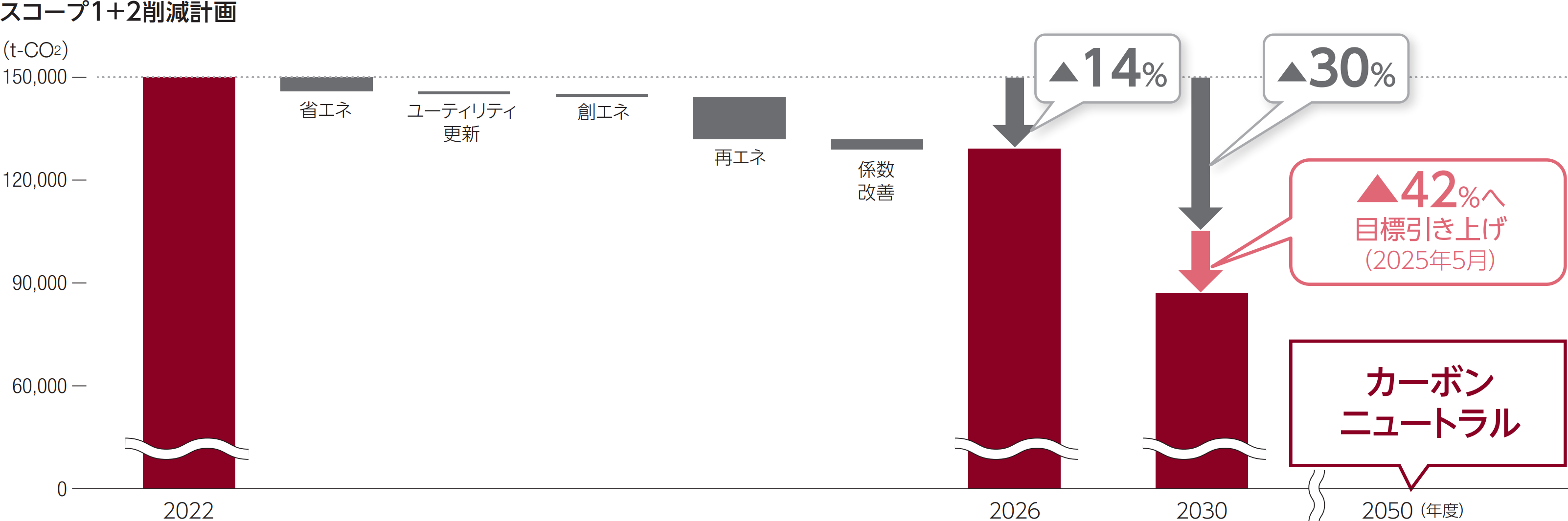 2050年度までにスコープ1+2のカーボンニュートラルを達成すべく、2022年度を基準年として、スコープ1+2を2026年度までに14%、2030年度までに42%を削減する目標を掲げています。この削減目標の達成に向けて、2023年度から2026年度にかけて温室効果ガス排出量削減に資する20億円の環境投資を計画しています。