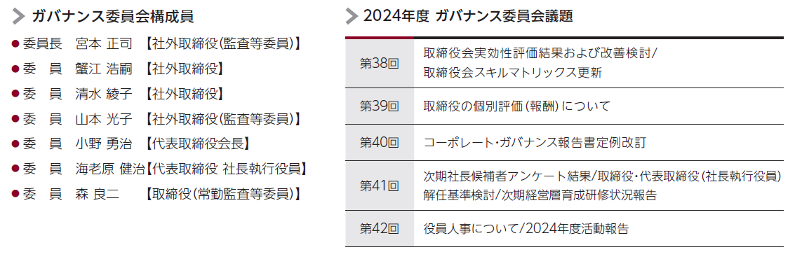 2016年4月より取締役会の任意の諮問委員会として、社外取締役(4名のうち2名は監査等委員である取締役)を主な構成員とする「ガバナンス委員会」を設置し、経営陣の指名・報酬を含めたガバナンスに関わる重要事項を審議し、企業の持続的な成長と統治機能のさらなる充実を目指しています。2024年度は、5回開催しました。監査等委員会設置会社への移行に伴い、監査等委員会とガバナンス委員会の内容重複がないこと、また、監査等委員会による意見陳述権行使のため、ガバナンス委員会での審議内容を監査等委員会でも共有することで両委員会の役割分担を図っています。