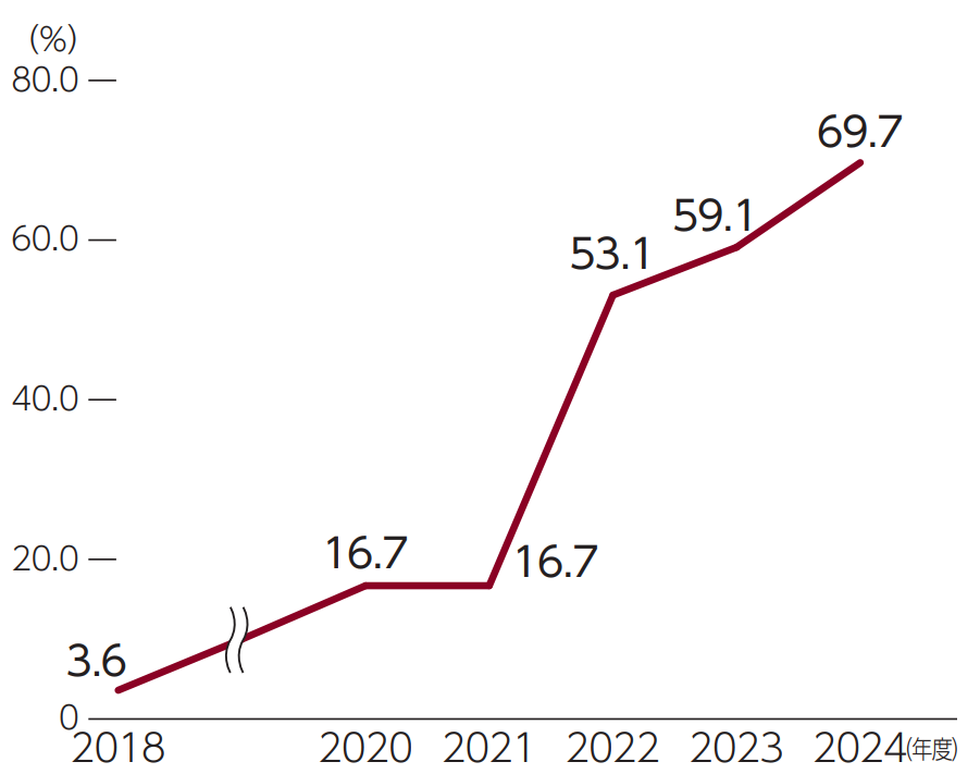 現中期経営計画に掲げた男性の育児休業取得率の向上に向けては、配偶者に出産予定がある従業員に対する取得意向確認はもちろんのこと、サポート金制度を導入するなど取得を後押ししています。また、育児休業取得者を抱える職場のフォロー体制の構築に取り組んでおり、育児休業取得者が在籍する部門の評価に加点する仕組みを構築しました。