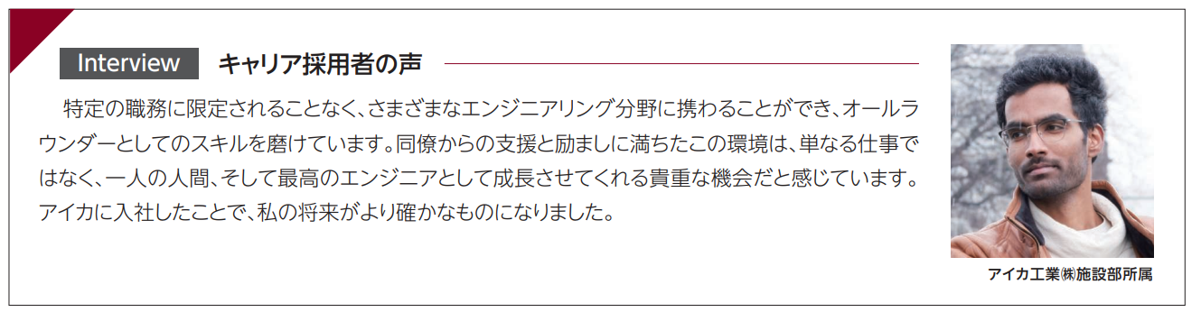 即戦力としての期待から、毎年一定数のキャリア採用を行っています。2024年度は、アイカ工業㈱に40名がキャリア採用で入社しました。採用職種も国内の生産・営業・研究開発・管理部門、海外拠点など多岐にわたっています。当社には現在314名のキャリア採用従業員が在籍しており、うち53名が取締役・執行役員・管理職のポストに就いています。また、経営陣(取締役・執行役員)におけるキャリア採用従業員の比率は25%、管理職におけるその比率は25%となっています。管理職におけるキャリア採用従業員の登用比率20%以上の維持を目標に掲げ、今後もキャリア採用を経営戦略と位置付けて、積極的な人材確保と管理職への登用を進めます。