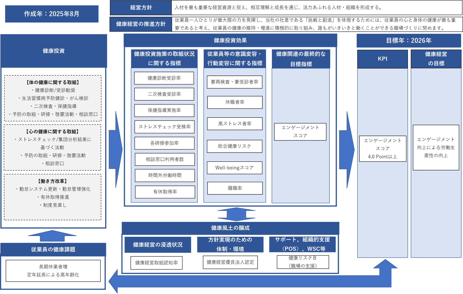 有給休暇取得状況や勤続状況など、健康経営に関連する実績値は、人事労務データをご覧ください。