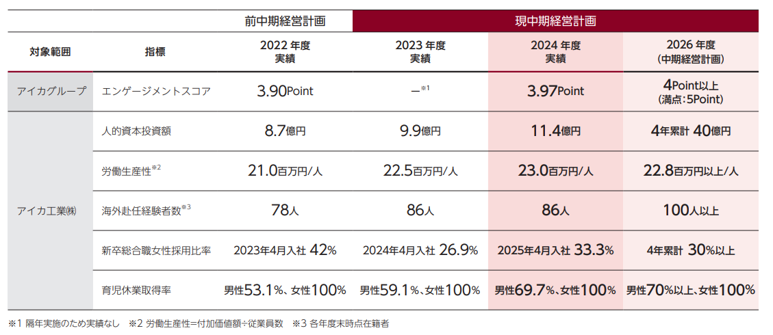 現中期経営計画において、「人的資本経営の基盤構築」をマテリアリティの中でも特に注力すべき項目として掲げ、経営指標に人的資本投資額およびエンゲージメントスコアを組み込んでいます。当社の直面するビジネス課題に対して求められる人材像を整理した上で、「人材育成」「ダイバーシティ・エクイティ&インクルージョン」「エンゲージメント」の3つを重点施策に位置付けています。重点施策に基づき、人的資本に対する投資を積極的に行い、従業員の働きがいの向上、ひいては労働生産性の向上を図り、アイカグループの持続的成長を生み出す好循環の活性化を目指します。