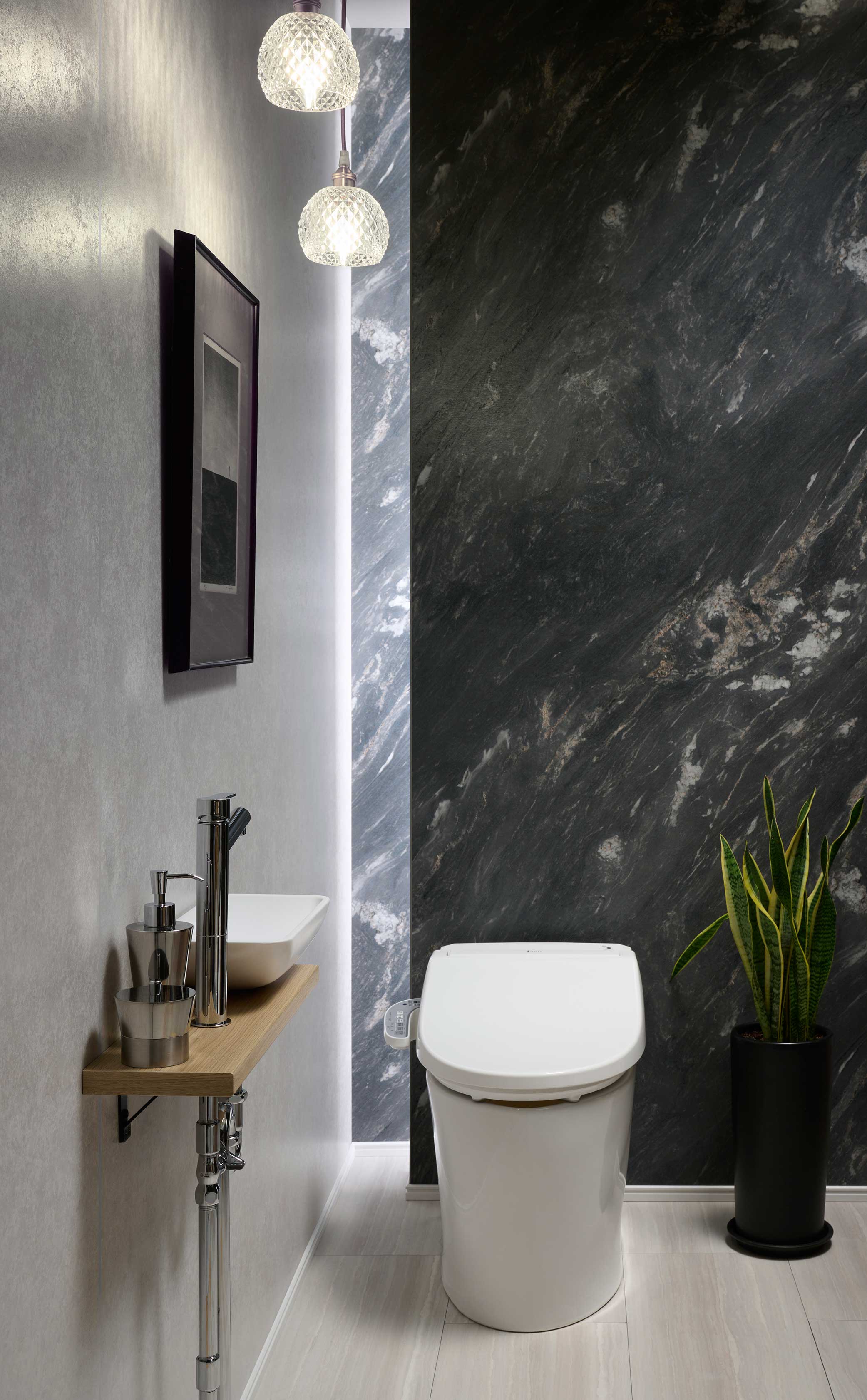 カウンターは奥行150㎜で0.5坪のトイレにも納まるサイズ感ながら、造作風の美しさを実現。
