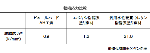 | ■ | 低収縮 従来の水性硬質ウレタン樹脂系塗り床材と比較して収縮応力が著しく小さいため、下地コンクリートからの剥離のリスクを低減します。従来の工法では必要不可欠であったカット目地の処理が本工法では不要となります。 |