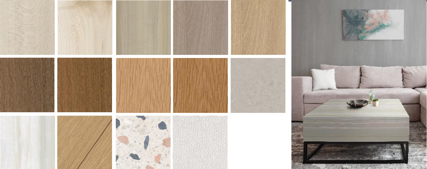当社の主力製品であるメラミン化粧板は、①豊富な色柄・仕上げ、②耐熱性・耐水性・耐摩耗性に優れた高い表面物性、③優れた加工性・施工性、といった特長があり、家具・什器・パーティションの表面材として広く使用されています。メラミン化粧板の国内トップメーカーである当社は、インテリアトレンドの移り変わりに合わせて毎年テーマを設定し、それらにふさわしい新柄を発表しています。