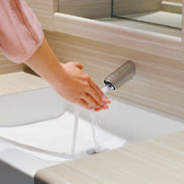 推奨の水栓金物との組合せで、水はねを少なくしています。壁水栓なので清潔です。
